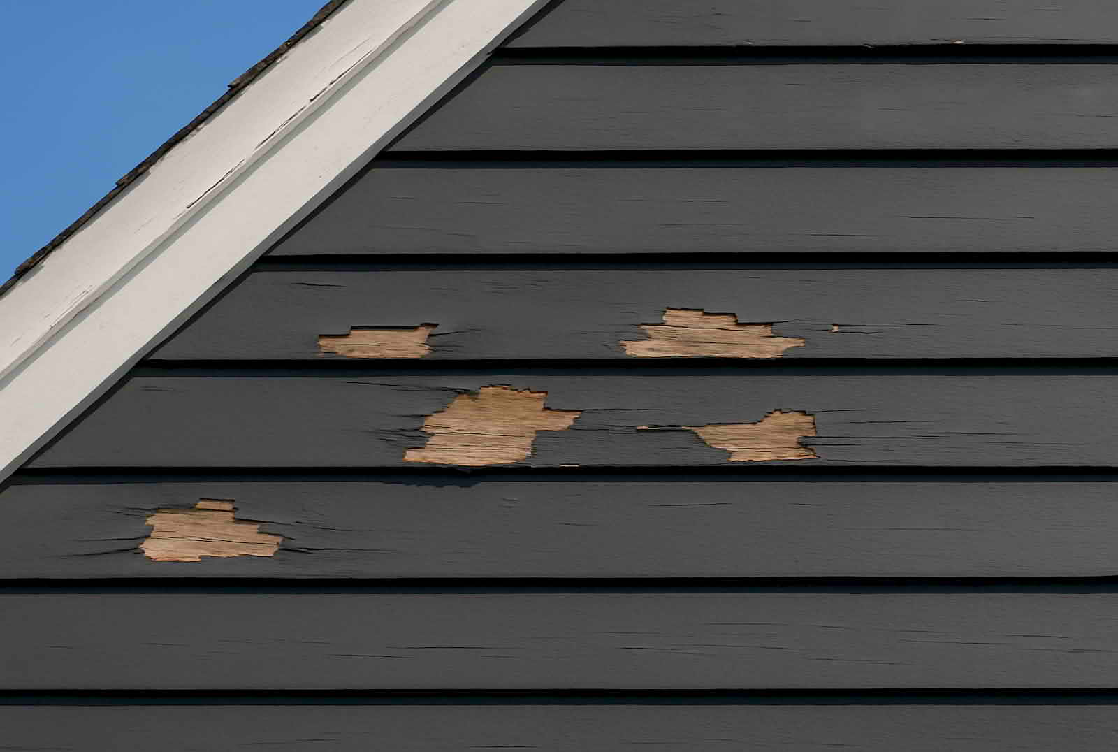 Close-up of damaged house siding with cracked and peeling paint, indicating need for exterior painting and maintenance.